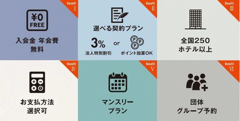 アパ直Bizは入会金・年会費が無料で、3%割引またはポイント加算が選べる契約プランを用意しています。全国250カ所以上のアパホテルで利用可能で、現地払いかクレジットカード決済の選択も可能です。長期滞在に便利なマンスリープランや、人数が多い場合にお得な団体・グループ予約にも対応し、法人の出張ニーズに幅広く応えます。